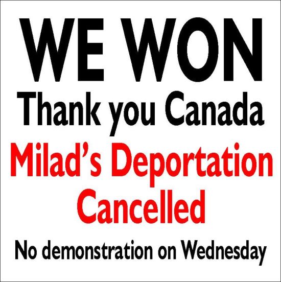 Good News - Milad's deportation is cancelled . No demonstration on Wednesday.