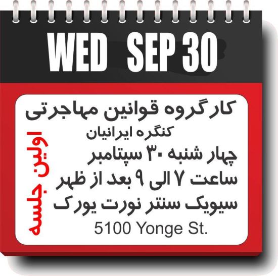 دعوت به تشکیل و همکاری با کارگروه قوانین مهاجرتی کنگره ایرانیان جلسه اول کارگروه قوانین مهاجرتی کنگره ایرانیان کانادا توسط خانم آريانا اديب راد در تاریخ چهارشنبه 30 سپتامبر، ساعت 7 بعد از ظهر در اطاق شماره یک سالن اجتماعات نورت یورک واقع در 5100 خیابان یانگ برگزار خواهد شد. این کارگروه در نظر دارد در درجه اول با اطلاع رسانی به آموزش و شناسائی افرادی که در رابطه با قانون جدید شهروندی با مشکلاتی روبرو شده و یا در آینده خواهند شد بپردازد.