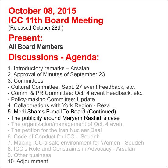 صورتجلسه یازدهم هییت مدیره کنگره ایرانیان این پیشنهاد را یکبار دیگر هم عنوان شد ولی هیچ کدام از اعضای هییت مدیره به آن جوابی نداده اند. بار دیگر آنرا تکرار میکنیم، با این امید که این بار جوابی داده شود: چرا هییت مدیره نیز مانند کمیته ها جلسات و دستور جلسات را قبل از تشکیل جلسات اعلام نمیکند؟ اگر شرح گفتگو ها به تاخیر اطلاع رسانی میشوند، حداقل از دستور جلسات به موقع با خبر خواهیم شد. https://d3n8a8pro7vhmx.cloudfront.net/…/ICC_Meeting-Oct_8-2… __________________________________ با عرض پوزش، من نمی فهمم برگزاری جلسات هیات مدیره "با حضور دیگران" چه تفاوتی با "ضبط صوتی یا تصویری" دارد. افراد غیر عضو منطقا باید ساکت بنشینند و شنونده باشند. بنابر این اگر جلسات ضبط و بعدا در مدیا منتشر شوند شاید مفیدتر باشد (هم تعداد بیشتری مطلع می شوند و هم از نظر تاریخی قابل استناد خواهد بود). Like · Reply · October 31, 2015 at 5:00pm