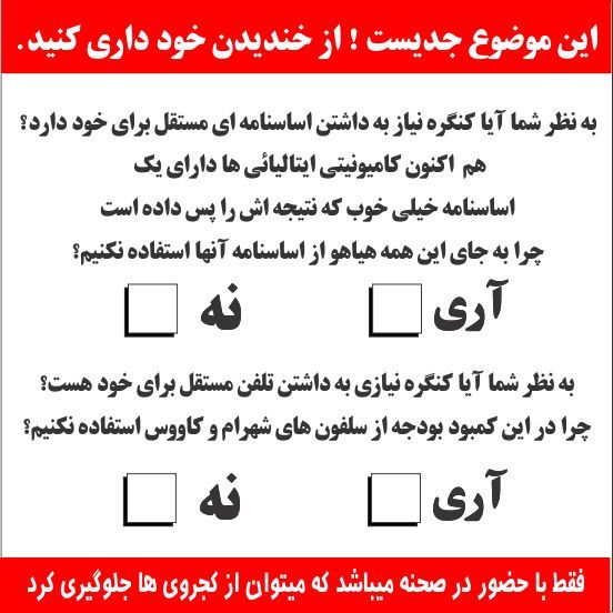 - تدارک نظر سنجی در رابطه با مصاحبه رادیوئی انگاری با تمایل همکاری گروه اقلیت، که ارسلان خبرش را داده است، در هییت مدیره و از طریق بعضی از اعضاء از جمله خود من فشار هائی برای بوجود آوردن محیط گفتگو بر کمیته مشارکت وارد شده است. در جلسه هفتم جولای بیژن و سوده با طرح صفحه فیسبوکی به دلیل کمبود نیرو مخالفت کرده اند. اینبار هم به نظر میاید بیژن عزیز احتیاج به چند تا لایک دارد تا یکبار دیگر این نیاز واقعی را نادیده گرفته و به تاخیر بیاندازد. به دلیل محدودیت هائی که برای من در صفحه لتس تاک وجود دارد باید صبر کنم که دیگر کسی کامنتی نگذارد تا بتوانم نظریات خود را آنجا عنوان کنم.