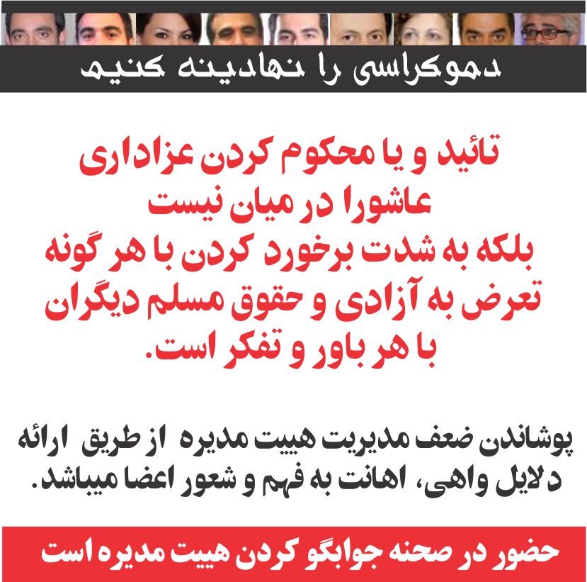 1 - نیاز جلسات گفتگو 2- موضوع اصلی محکوم کردن و یا تائید کردن عزاداری در میان نیست. 3- برخورد با رفتار های تعرض آمیز 4- ضعف مدیرت هییت مدیره 5- حضور در صحنه اعضا