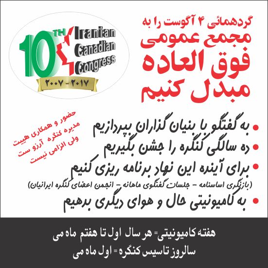 - به بررسی فعالیت های هییت مدیره بپردازیم خوب خواهد بود اگر برگزار کنندگان این جلسه مسئولیت برنامه ریزی این فعالیت ها را حداقل در سال آینده پذیرفته و آنرا در این جلسه اعلام میکردند. من هم به عنوان یکی از افراد کامیونیتی قصد دارم به سهم خود با برگزارکنندگان همکاری کنم. از هییت مدیره، رسانه ها، و همه کامیونیتی دعوت میکنم تا روز های باقی مانده تا گردهمائی را به یک کمپین مبدل کنیم. با فعالیت، مشارکت، اطلاع رسانی لایک، کامنت، و به اشتراک گذاشتن مطالب، به حضور خود افزوده و آنرا اعلام کنیم. با به اشتراک گذاشتن خاطرات، اطلاعات، مطالب، ویدئو و اسنادی که در اختیار داریم تاریخچه این نهاد را تکمیل کنیم. برگزارکنندگان را در تدارک گردهمائی یاری دهیم. از پیشنهاد، راهنمائی، کمک های داوطلبانه، و مالی دریغ نکنیم.