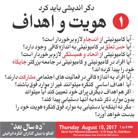 بی شک نسبت به ده سال پیش بنیان گزاران، امروز برای ما راحت تر است که از اهداف و هویت این نهاد بگوئیم. به صراحت میتوان گفت که کنگره در ده سال گذشته جز سر پا نگاه داشتن خود حرکت مثبت و چشم گیری انجام نداده است. و متاسفانه هر ساله سرچشمه و مسبب تفرقه در کامیونیتی بوده است. اگر نمیخواهیم که ده سال بعد را به همین منوال بگذرانیم بهتر و لازم است که به بازبینی تعریف، اهداف و هویت این نهاد بپردازیم. چه بهتر که از امروز به گفتگو پیرامون این موارد پرداخته که در روز 10 آگوست با آمادگی بیشتری در گردهمائی "ده سال بعد" شرکت داشته باشیم.