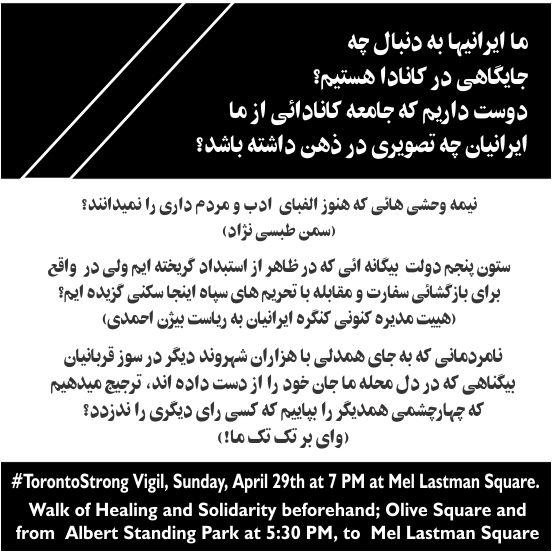 از بیژن احمدی و هییت مدیره کنونی هیچ انتظاری ندارم. چشم امیدم به شما ده کاندیدا دوخته است که قبل از اینکه درگیر مسئولیت های سازمانی و روردرروئی های همیشگی شوید، همصدا و همقدم از همه ایرانیان دعوت کنید که فردا یکشنبه 29 آپریل به جای انتخابات به جمع شهروندان جامعه بزرگتر بپیوندیم و عملن ثابت کنیم که ما در درجه اول خود را یک کانادائی میدانیم. بیائیم از این موقعیت حساس استفاده کنیم به شک و تردیدهائی که در اذهان عمومی به علت فعالیت های مخرب کنگره بوجود آمده پایان دهیم.