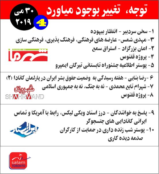 اینهم پوستر چهارمین بررسی هفتگی رسانه های کامیونیتی، و بررسی که در کامنت ها خواهد آمد. اولی را در صفحه باهمستان، دومی را در صفحه لتس تاک، سومی را در پرژن میرور و این یکی را در صفحه تریبون آزاد تورنتو، و بعدی را در صفحه بچه های تورنتو به اشتراک خواهم گذاشت. غیر از این صفحات هم صفحه دیگری نمیشناسم که در آنها در رابطه با موضوعات مختلف کامیونیتی بصورت آزاد گفتگو شود. اگر میشناسید لطفن معرفی کنید.