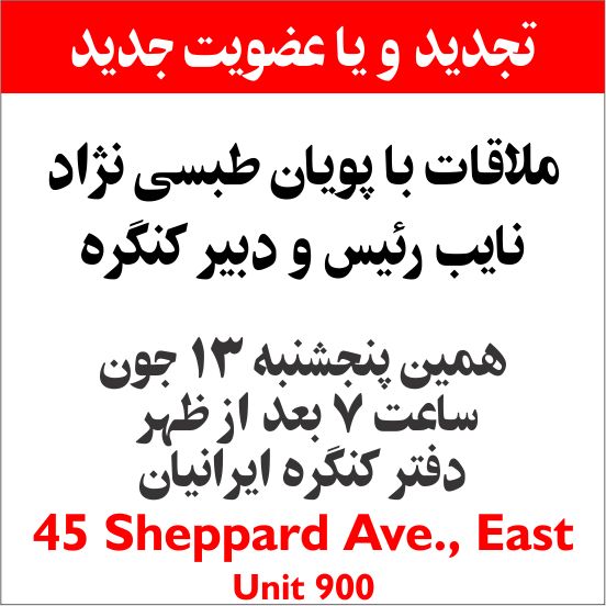 بعد از بیش از سه ماه بالاخره موفق شدیم که قراری با پویان طبسی نژاد، نایب رئیس و دبیر کنگره ایرانیان تنظیم کنیم. شما هم اگر مثل من به روش آنلاین در سایت کنگره اعتمادی ندارید و ترجیح میدهید که بصورت حضوری به عضویت کنگره در بیائید و یا اینکه عضویت خود را تجدید کنید، از این فرصت طلائی استفاده کنید. وگرنه مجبور هستید که برای قطار بعدی سه ماه در نوبت در ایستگاه بایستید. ___________________________ به همه توصیه میکنم که امسال حداکثر سعی خود را بکنیم که تغییر و تحولی در هییت مدیره بوجود آوریم. چه بهتر که این تغییر و تحول با همکاری و تفاهم اعضای فعلی هییت مدیره صورت بگیرد. و گرنه راه دیگری جز انتخابات نیست، که اولن میبایست تا حد امکان تلاش کنیم که سالم برگزار گردد. و در ثانی میبایست حضور و مشارکت در انتخابات را آنقدر بالا ببریم که با پیوستن اعضای جدیدی با نگرش های متفاوت، به تکصدائی هییت مدیره خاتمه داده شود. __________________________ از فرصت استفاده کرده و از هم اکنون کاندیداتوری خود را در انتخابات بعدی اعلام میدارم. اگر شما هم مانند من طالب بوجود آمدن هییت مدیره ای هستید که فعالیت هایش بر پایه تفاهم، شفافیت و مشارکت حداکثری هست، کاندیداتوری خود را از هم اکنون اعلام کنید. اگر هم بر توانائی های من برای بوجود آوردن دگرگونی در هییت مدیره باور دارید، از هم اکنون با پیوستن به کنگره، فعالیت های انتخاباتی مشترک خود را آغاز کنیم. اینرا در هم در خاطر داشته باشیم که کس نخارد پشت من جز ناخن انگشت من.