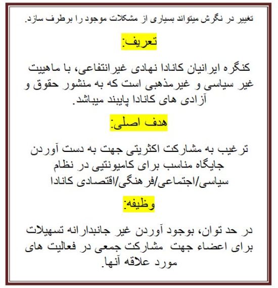 با اینکه ثبت فدرال کنگره بر خلاف اساسنامه بوده است، یکی از مزایای آن پیوستن افرادی از استان های دیگر با نیروی جدید در گفتگو هاست. از فرصت استفاده کرده و در باره تغییراتی که قصد داریم در اساسنامه بعد از پایان دادن به اشغال چهار ساله بوجود آوریم، گفتگو ها را آغاز کنیم. اگر کاندیدا های انتخاباتی در این گفتگو ها شرکت کنند میتوانیم از آنها و برنامه هایشان آشنائی بیشتری پیدا کرده و به گونه ای مناظره انتخاباتی را که میتواند مشوق پیوستن به کنگره باشد آغاز کنیم. |