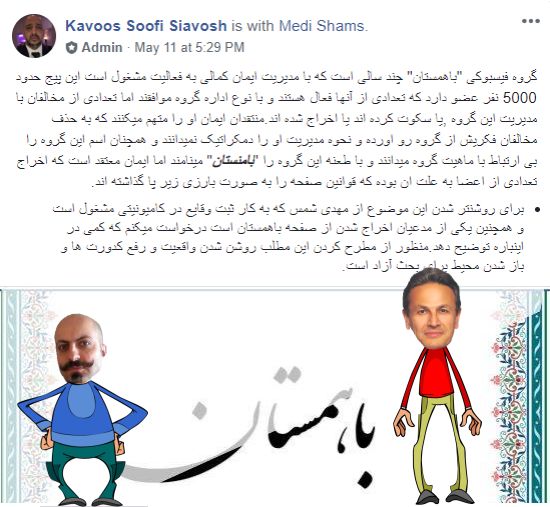 کاووس عزیز، در مطلبی که چند روز پیش در همین صفحه به اشتراک گذاشته است، به صفحه باهمستان و نحوه مدیریت ایمان کمالی سروستانی پرداخته و از من هم دعوت کرده که به دو دلیل که یکی از آنها داشتن اطلاعات است در آن مشارکت کنم. از آنجائیکه که به نظر میاید ایشان در آغاز و پایان دادن به این موضوع کمی عجله دارد و به عکس، من این مورد را آنقدر با اهمیت میدانم، که بخواهم با حوصله بیشتری به آن بپردازم، آنرا بصورت جداگانه و بنام خود مطرح میکنم. دلیل دوم دعوت کاووس، حضور من در لیست 15 الی 20 نفری از مخالفینی میباشد که اخیرن توسط ایمان از صفحه باهمستان توسط ایمان پاکسازی شده اند است. ناگفته نماند که خانواده سروستانی، ایمان و نازگل عزیز، اینجانب را مورد لطف بیشتری قرار داده اند. نه تنها به دوستی فیسبوکی مان خاتمه داده، بلکه با بلاک کردن من هیچگونه امکان تماس عادی را برایمان باقی نگذاشته اند. در نتیجه برای مطلع شدن از مطالب یکدیگر یا باید از سوراخ کلید نگاه کنیم و یا اینکه از بالای دیوار سرک بکشیم. پس موردی ندارد که این مطلب به نام فرد سومی به اشتراک گذاشته شود، که در آنصورت نیز امکان مشاهده مطالب یکدیگر برایمان وجود نداشته است. __________________________________ مدت مدیدی میباشد که از فرد نگری فاصله گرفته ام. از آنجهت که هر فعال اجتماعی در جامعه تاثیر گذار است، و نحوه تاثیر گذاری به خصوصیات نفسانی و اخلاقی نیز مربوط میگردد، من هر فعال اجتماعی را یک پدیده اجتماعی میشناسم. از لحظه ای که فرد به یک صفحه عمومی در سوشیال مدیا، با اهداف اجتماعی میپیوندد، من ایشان را یک فعال اجتماعی با وظیفه و حقوق برابر میدانم. البته میزان تاثیر گذاری، وظایف و حقوق، به تناسب میزان مشارکت و مسئولیت پذیری متغیر است. ____________________________________ در نتیجه من خود را با شخص ایمان رودررو نمیبینم. بلکه با قرار گرفتن پدیده ایمان کمالی سروستانی با پدیده مهدی شمس، که هر کدام نشانگر مجموعه ای از پدیده های اجتماعی میباشند، در شرایط مکانی و زمانی خاص، بحرانی بوجود آمده است، که بررسی آن میتواند در شکل دهی، تاثیر گذاری، شناخت، تغییر و تحول اذهان عمومی و رفتار ها مفید باشد. ___________________________________