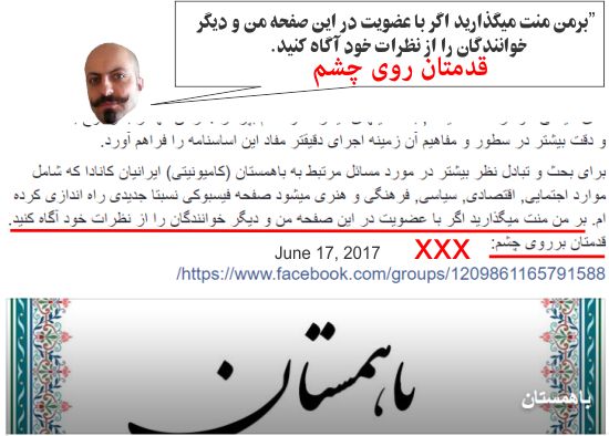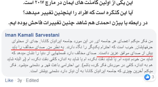 زمانی که به مرور گفته های ایمان در آن تاریخ و در رابطه با موضوع جذف میپردازم، واقعن تعجب میکنم. آن ایمان، ایمان امروز نیست که ده ها نفر از مخالفین خود را در یک حرکت از صفحه باهمستان که مدیریتش را به عهده دارد حذف میکند. این تغییر و تحول را در بیژن احمدی هم دیده ایم. مشکل میتوان باور کرد که بیژن احمدی در زمان کمپین "من هم یک ایرانی-کانادایی هستم" که چند ماه بطول کشید نقش بازی میکرده است. بیژن احمدی از بعد از پیوستن به هییت مدیره در سال 2015، بخصوص از ماه سپتامبر که موضوع بازگشائی سفارت مطرح شده، مورد استقبال قرار گرفته، و تشکل همسویان آغاز میگردد، کاملن به شخصیت دیگری مبدل میگردد.