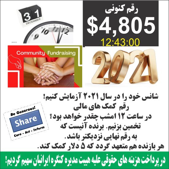 شاید ندانید که شکایتی علیه هییت مدیره سابق کنگره ایرانیان در دادگاه انتاریو مطرح گردید که نیاز به زمان است تا به دست آورهای با ارزش آن آنطور که باید پی بریم. البته این دستاورد ها بی هزینه نبوده اند و امروز باید به کمک هم این هزینه های را جمع آوری کنیم. ______________________________ فکر میکنید راس ساعت 12 امشب که سال تحویل خواهد شد موفق میگردیم چه مبلغی را جمع آوری کنیم؟ این گوی و این میدان. تخمین بزنیم. فقط 5 دلار هزینه دارد. ببینیم کدام یک ما در تخمین اعداد البته با شناخت کامیونیتی مهارت بیشتری دارد. البته میتوانیم هر چند بار که مایلیم تخمین خود را تغییر دهیم ولی برای هر تخمین میبایست بصورت جداگانه 5 دلار کمک کنیم. تصورش را بکنید نزدیک های ساعت 12 شب چقدر رقابت ها پر هیجان خواهند بود. _____________________________ بیائیم امسال با همدلی به استقبال 2021 برویم. این هم لینک گوفاند برای جمع آوری کمک ها.