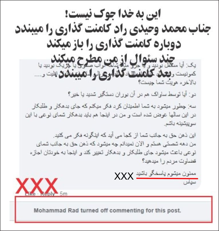 تو عمر طولانی ام بسیار دیده ام ولی این یکی در نوع خودش بی نظیر است. جناب محمد وحیدی راد یک فرد رسانه ای یک ویدئو در این صفحه به اشتراک میگذارد. بعد از کامنت من کامنت گذاری را میبندد. دوباره بازش میکند تا به من جواب داده و چند سئوال مطرح کند و دوباره آنرا میبندد. با در نظر گرفتن اینکه این فرد یک رسانه ایست و ویدئویی که به اشتراک گذاشته است در باره دیگران میباشد چه باید گفت.؟ این کامیونیتی ما ست. اگر هر کسی راه بقا را در آن نیابد رفتنیست. جناب راد از حالی که دادی متشکرم. مطلب ایشان را در همین صفحه میتوانید مشاهده کنید.