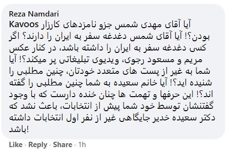 07:01:28 p.m. EST هییت مدیره کنگره ایرانیان امروز سه شنبه ۲۳ فوریه ۲۰۲۱ جناب رضا نامداری یکی از کاندیداهای پویش همبستگی و صلح در رابطه با تهمت وابستگی مهدی شمس و خانواده اش به مجاهدین که در زمان رقابت های انتخاباتی توسط آرزو خدیر صورت گرفت در جواب کاووس صوفی کامنتی در صفحه آی سی سی فوروم میگذارد که باعث شرمساری همگان است. این عزیز کار را به جایی میرساند که، تهمتی دیگری را به من روا داشته و مورد تمسخرم قرار میدهد. صلاح دیدم که آن عزیزان را از آن مطلع سازم. مورد اتهام ناروا قرار گرفتن از طرف نایب رییس کنگره ایرانیان موضوع بی اهمیتی نیست که نادیده گرفته شود. بیشک این موضوع بار ها و بار ها مطرح خواهد شد و هر بار باعث بی حرمتی این نهاد و هییت مدیره اش خواهد بود. این اولین بار نیست که به اینجانب اتهام عاملیت به جمهوری اسلامی و یا مجاهدین زده میشود. ولی این اولین بار است و امیدوارم که آخرین بار باشد که یکی از اعضای هییت مدیره، بخصوص نایب رییس آن به چنین عمل زشتی دست میزند. امیدوارم که این مورد برای شما به اندازه کافی اهمیت داشته که بعد از دریافت اولین ایمیل من در تاریخ ۵ ژانویه به دنبال تحقیق در باره آن شده باشید. نتیجه تحقیقات شما چه بوده است؟ آیا آرزو خدیر دست به چنین عمل زشتی زده است؟ در غیر اینصورت این اتهام دروغین من به ایشان آنقدر برای شما ناچیز است که هیچ عکس العملی به آن نشان ندهید؟ من به سادگی میتوانم از حق خود بگذرم ولی از حقوق جمعی و وظیفه ای که به عهده هر کدام از ما برای مقابله با اتهام، دروغ، توهین و برچسب است چطور؟ باور کنید که هر بار این موضوع مطرح میگردد موقعیتی میباشد تا هر کدام از ما انسانیت خود را زیر سئوال ببریم. اگر شما عزیزان نتوانید با مشکلی به این کوچکی برخورد صحیح نمایید چگونه میخواهید نمایندگی و سخنگویی یک کامیونیتی ۳۰۰ هزار نفره را به عهده داشته باشید؟ مشکلات نیازمندان را رفع کنید؟ و از حقوق ما در مقابل هر متعرضی دفاع کنید؟ شاید این یک آزمایش است تا ما اعضاء دریابیم که آیا انتخاب ما انتخاب صحیحی بوده است؟ تحت عنوان گپی با رضا نامداری دلنوشته ای را با او درمیان گذاشتم که با شما نیز در میان میگذارم. بدون هیچ خشم و کینه نسبت به کسی از شما تقاضای همدلی دارم. مهدی شمس – کاندیدای مستقل در انتخابت اخیر که نسبت به ۲۹۶ عضو این نهاد متعهد شده است.