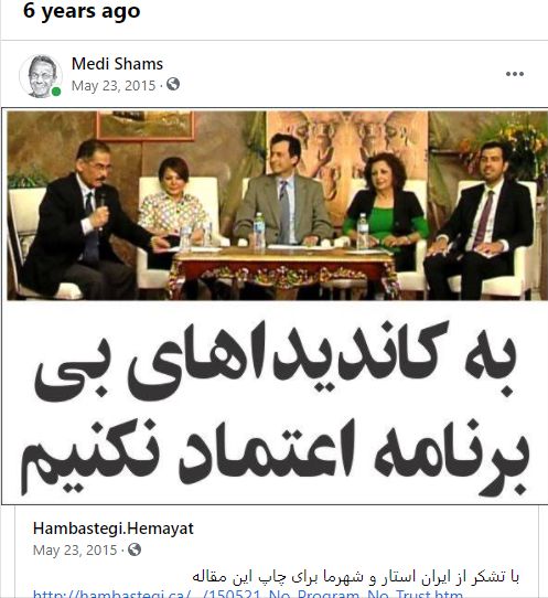 ما همه مقصریم. فیسبوک گناه کبیره را یاد آوری میکند. یکی بود یکی نبود. دقیقن، روز به روز، شش سال پیش در ۲۳ ماه می ۲۰۱۵ قرار بود مناظره ای بین کاندیدا ها در تلویزیون آی تی سی (شهرما) برگزار گردد، که به علت عدم حضور کاندیدا های برانداز برگزار نشد. البته همه ما بصورت یکسان سهمی در این فاجعه نداشتیم. من اعتراف میکنم که بیشترین سهم را در این خطا داشته ام. چون بدون حمایت های من، سوده قاسمی و بیژن احمدی به خواب شبشان هم نمیتوانست بیاید که به این سرعت در چنین جایگاهی قرار بگیرند. البته همه گناه ها به گردن من نبود. ارسلان کهنمویی پور در سمت ریاست کنگره، که هنوز سال تمام نشده، تصمیم به استعفای خود را اعلام میکند، میترا صفاری که رنج هجرت را به درد مقاومت ترجیح میدهد، و شهرام تابع محمدی که با نه دقیقه تاخیر کاندیداتوری خود را اعلام میکند، هم مقصر بوده و بار سنگینی از گناه به گردن آنها میباشد. البته رضا بنایی و دیگر براندازان نیز مبرا نیستند. اگر روحیه شان را نباخته بودند با کمی تلاش مطمئنن پیروز میشدند. چون فقط ۱۰۰ رای اختلاف بود. اگر رضا بنایی با کاندیداتوری شهرام مخالفت نکرده بود، مطمئنن هییت مدیره شکل و شمایل دیگری به خود میگرفت. بعید نمیدونم که یکروز پویشی ها هم مجبور به اعتراف شوند که بهتر بود در انتخابات ۲۰۲۰ شکست میخوردند. فعالیت های انجام شده تا امروز، وضعیت صفحه فوروم باید برای بسیاری از آنها بیدار کننده باشد. ـــــــــــــــــــــــــــــــــــــــــــــــــــــــــــــــــــــ البته خطا هایی دیگری هم داشتیم که در کامنت ها به آنها خواهم پرداخت. باشد که افرادی جدیدی که به تازگی به کنگره پیوسته اند از این طریق با گذشته این نهاد بیشتر آشنا گردند. بخصوص بعضی از آدمین های جدید این صفحه که مانند کودکان معصوم رفتار میکنند. ــــــــــــــــــــــــــــــــــــــــــــــــــــــــــــــــــــــــ https://iccma.ca/articles/2015/150521_No_Program_No_Trust.htm