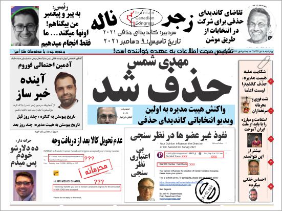 حکایت فوروم و سانسور ابتدا مطالبم که ۱۰۰٪ به کنگره مربوط میشوند را فقط در صفحه فوروم به اشتراک میگذاشتم. زمانی که تعداد حذف ها زیاد گردیدند، بعضی از آنها را در صفحه لتس تاک از طریق صفحه فوروم به اشتراک میگذاشتم، که اگر آنها را حذف کردند، رونوشت آن در صفحه لتس تاک باقی بماند. زمانی که حذف ها باز هم بیشتر شدند اول در صفحه لتس تاک وبعد از طریق آن مطالبم را در فوروم به اشتراک میگذاشتم. و متاسفانه اکثر مطالبم بعد از حذف و ویرایش های متعدد بالاخره موفق میشدند که از مرگ رهایی یابند. بالاخره به این نتیجه رسیدم که دونسخه از مطالبم تهیه کنم. یک نسخه اختصاصی برای فوروم کنگره و یکی هم برای لتس تاک. این توضیح را لازم میدانستم، چون هدف اذیت و آزار یکدیگر و اتلاف وقت نیست. کم و بیش فوت و فن مدارایی با آدمین های فوروم را پیدا کرده ام. به نظر من میشود به مبارزه ادامه داد بدون آنکه نیاز به خشم و توهین و افترا باشد. این همان فرهنگ سازی میباشد که من از خود آغاز کرده ام. چکیده و فوری از آنجاییکه گفتنی های بسیار است و آنچه میرود نیز فوریت دارد، فعلن فقط صفحه اول «زجرناله» را منتشر کردم. از آنجاییکه جناب کیهان رضوی استعفاء داده اند و امکان انتشار خبرنامه پایین آمده است، چه بسا که این نشریه بتواند نبود خبرنامه را جبران کند. انتخابات و حذف گفته شد که من عضو کنگره نیستم. کپی رسید پرداخت ده دلار حق عضویت در ۱۲ جون را در صفحه اول «زجرناله» منتشر نمودم تا شاید رفع خطا گردد. در ضمن تا همین اواخر اطلاعیه های نظرسنجی دوم را از طرف کمیته سیاست گذاری که فقط برای اعضاء ارسال میشد را دریافت میکردم که یک نسخه از آنرا در «زجرناله» به اشتراک گذاشته ام. اعتراض به حذف همین امروز اعتراض خود را به حذف من از کاندیداتوری برای هییت مدیره و کمیته انتخابات ارسال خواهم داشت که در نهایت من هم مانند محمد وحیدی راد و دانیل باقری سروستانی از طریق موشن بتوانم در انتخابات شرکت کنم.