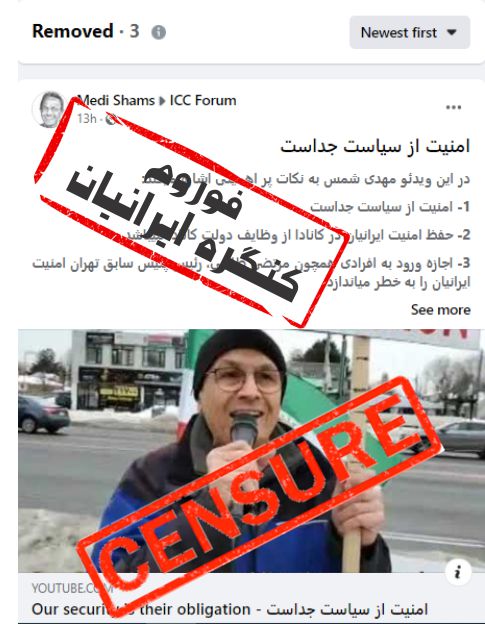 در کمتر از ۴۸ ساعت سه مطلب حذف میگردند: اولی در رابطه با تعرض به خلیج فارس توسط رکسانا فرمانفرماییان در حضور بیژن احمدی و یونس زنگی آبادی میباشد که این دو تن عکس العملی از خود به آن نشان نمیدهند. دومی در رابطه با اعتراض به حضور مرتضی طلایی رپیس سابق پلیس تهزان در کانادا است. سومی ویدپو سخنان بیژن احمدی در مجلس سنا در رابطه با عدم صداقت و شفافیت در جوابگویی به سئوال یک از سناتور ها در رابطه با اینکه کنگره ایرانیان چه بخشی از کامیونیتی را سخنگو میباشد. نه اخطار، نه توضیح و نه امکان تصحیح مسخره نیست که نمیتوانیم حتی: - نام روسای سابق کنگره را بر زبان بیاوریم؟ - به کرده و گفته های آنان استناد کنیم؟ با مشاهده چنین رفتار هایی دست دعا بسوی آسمان بلند میکنم و سر به سجده میگذارم که خدا انسان را دندان هایی مانند دندان گرگ نداد، شاخی مانند شاخ گاو نداد، و بالی مانند بال عقاب نداد. ولی بعضی از انسان ها را همانطوری افرید که جورج اورول به بهترین وجهی در مزرعه حیوانات به نقل آن پرداخته است. به زبان لری میتوان اینطور نتیجه گیری کرد که بی خیال خلیج فارس و رضا طلایی. بیژن احمدی را بچسب.