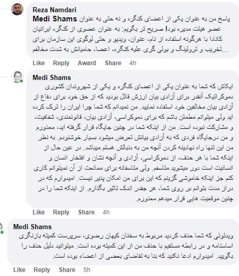 ریزش کرده است. مطمئن هستم که همسویان دراین گفتار صداقت و شفافیت از طرف من نمیبینند. و این جای تاسف است که میزان اعتماد متقابل نیز میان دو جناح ریزش کرده است. تنها موردی که در کنگره ریزش نکرده است ادعا های پویشی ها است. من خودم را در این ریزش مسئول میدانم فکر نمیکنید اگر ما از ریزش اعضاء مطلع شده بودیم، همان زمان در هییت مدیره بیداری بوجود میاوردیم؟ هییت مدیره را مواخذه میکردیم؟ و چه بسا به دنبال راه حلی میشدیم. اینرا هم تا به حال آموخته ایم که فرهنگ ما به ما اجازه نمیدهد که بصورت شفاف و صادقانه حرف هایمان را بزنیم و بیشتر تمایل داریم که با هم نزاع کنیم. همین نزاع میتواند مشارکت را بالا ببرد، توجه را به خود جلب کند و تعداد بیشتری از افراد را وارد صحنه کند. پیشنهاد به پرژن میرور و آی سی ژورنال چرا این دو رسانه که همتی کردند و چند تا مصاحبه برگزار کردند، گفتگو های دو نفره میان دو جناح بوجود نمیاورند؟ من خودم را داوطلب میکنم و از رضا نامداری دعوت میکنم که در یک گفتگوی دو نفره در رابطه با مدیریت صفحه فوروم صحبت کنیم. من به عنوان کسی که بیشترین حس مالکیت بر این صفحه را دارم و ایشان به عنوان حاکم مطلق این صفحه اصل مطلب گفتگوی "کامنتاتوری" امروز با ایشان داشته ام، که آنرا همراه این مطلب به اشتراک میگذارم. ایشان به موارد زیر اشاره میکنند: با هرگونه استفاده از 1. نام 2. عنوان 3. ویدیو 4. حتی لوگوی این سازمان 5. برای تخریب 6. ترولینگ 7. و بولی گری 8. علیه کنگره 9. اعضا، 10. حامیانش به شدت مخالفم. من از ایشان دعوت میکنم که به گفتگو پیرامون این موارد بپردازیم تا با نگرش و برداشت یکدیگر آشنا شویم. گفتگو بوجود آوریم. مشارکت را بالا ببریم. از دیگران بخواهیم که در گفتگو های شرکت کنند و نظرات خود را عنوان کنند. حتی اگر آنها علاقه ای نشان ندهند، حداقل من و ایشان از یکدیگر شناخت بیشتری پیدا خواهیم کرد. چه بسا در آینده از شدت رودرویی ها و سانسور ها کاسته شود. اولین سئوال من از رضا نامداری