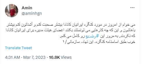 بهار رهایی کنگره ایرانیان امین را نمیشناسم. از توییت هایش در رابطه با کنگره ایرانیان برمیاید که این نهاد را به خوبی میشناسد و اطلاعاتی که در اختیار میگذارد همگی صحیح و دقیق میباشند. مهم هم همینست. ایکاش به تعداد امین ها اضافه میشد تا بتوانیم با به اشتراک گذاری مطالب آنها به اطلاع رسانی و بوجود آوردن آگاهی، بخصوص در ایام انتخابات سرعت و وسعت بیشتری بدهیم. اگر کسی در اینستاگرام از حضور فعالیت هایی در مخالفت با هییت مدیره همسوی کنگره اطلاع دارد، لطفن اینجا اطلاع رسانی کند که در آنجا نیز حضور داشته باشیم. از همگی و بخصوص از آنهاییکه با این نهاد آشنایی ندارند دعوت میکنم که مطالب امین در توییتر را دنبال کنند. البته من سعی میکنم آنها را اینجا به اشتراک بگذارم.