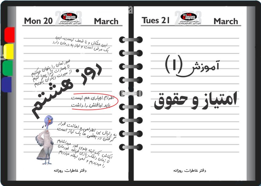روز هشتم- آموزش (1) امتیاز و حقوق در یک نهاد دموکراتیک افراد دارای حقوق میباشند و هییت مدیره در مقابل این حقوق وظایفی دارد. در فوروم کنگره اعضاء .دارای حقوق میباشند و آدمین های آن موظف هستند که ضوابط تعیین شده آنرا مو به مو به اجرا درآورده و پاسخگو باشند. در صفحه لتس تاک نیز که برای گفتگو پیرامون موارد مربوط به کنگره توسط چند نفر برپا شده است، آدمین ها امکاناتی را که در اختیار قرار میدهند امتیاز میباشند و نه حقوق. از سر بی توجهی و شاید هم عدم آشنایی، بعضی از ما به این دو نکته توجه نکرده و یا مغرضانه جای یکی را با جای دیگری اشتباه میگیریم. اگر آدمین های یک صفحه شخصی برای خود وظایفی قائل میشوند، سعی میکنند که مدارا گر، صبور، پاسخگو و های را با هوی جواب ندهند، به خاطر احترام به خود است که هر بی حرمتی به دیگری بی حرمتی به خود است، حتی اگر های، هوی را بطلبد.