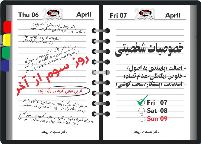 روز سوم از آخر- خصوصیات شخصیتی فرهنگ جمعی کامیونیتی و خصوصیات شخصیتی فعالان خط اول، دو عامل اصلی تاثیر گذار در شکل دهی کنگره و کامیونیتی میباشند. دو نهاد رسانه ای فوروم و لتس تاک با دو ساختار متفاوت، کم و بیش یک مسیر را طی کرده و در یک وضعیت قرار دارند. 1- فوروم با ساختاری دموکراتیک بیشتر تحت تاثیر خصوصیات شخصیتی گردانندگان آن قرار گرفته است. 2- لتس تاک با ساختاری خصوصی بیشتر تحت تاثیر فرهنگ جمعی شکل گرفته است. عدم مشارکت، عدم اعتماد، و عدم گفتگو، چه میان دو جناح و چه داخل هر دو جناح، کنگره و کامیونیتی را در بن بست قرار داده است. یکی از راه های رهایی از این وضعیت، میتواند از طریق دو نهاد رسانه ای فوروم و لتس تاک که تنها محیط های گفتگو میباشند باشد. راه حل، راه حل، و باز هم راه حل لازم است که فوروم کمتر تحت تاثیر خصوصیات شخصیتی اداره کنندگان آن قرار بگیرد. با بهره گیری از ساختار خصوصی لتس تاک باید بتوان ساده و سریعتر، نه تنها محیط را برای ایجاد گفتگو مهیا ساخت، بلکه از طریق آن بر کجروی های فوروم نظارت و تعادل را برقرار کرد. بعد از 15 سال همچون یتیمی در بند زن بابا و مادران جعلی بودن، برای بسیاری کنگره به هیولایی مبدل شده است که باید نابود گردد. امسال که هییت مدیره کم رنگ تر از هر دوره دیگر شکل گرفته است، این امکان وجود دارد که یتیم رها گردد. باید مراقب بود که یتیم در چنگال شوهر نه نه ایی نیفتد و 15 سال دیگر مورد تعرض و شکنجه قرار بگیرد. برای مادران حقیقی دلسوز این نهاد با هر شکل و شمایل و وضعیتی، اهمیت خود را از دست نداده و قابل اصلاح میباشد. جای تعجب نباید باشد که مادران جعلی به وفور و مادران حقیقی نادر باشند. آنچه بر این نهاد صادق است بر خانواده، کامیونیتی و وطن نیز حاکم است.