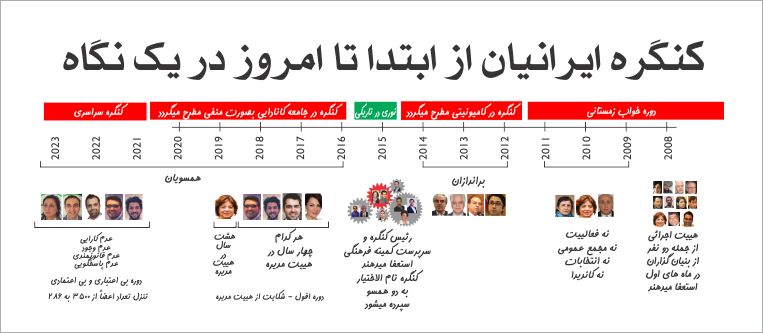 امیدوارم که امیر حسن قاسمی نژاد تفرشی پی برده باشد که ثبت وقایع و وجود کسی که به آنها مسلط است برای ممانعت از تحریف تاریخچه این نهاد الزامی میباشد. وگرنه هر کسی آنرا در جهت منافع خود میتواند شکل دهد. محمد وحیدی راد از دوره های مختلف در کنگره صحبت و در رابطه با عدم جانبداری سئوال میکند. شعله طبق معمول سئوال را ناشنیده گرفته و به گفته های نامربوط خود ادامه میدهد. شاید این تصویر به سئوال محمد وحیدی راد پاسخ دهد. در یک نگاه میتوان دید که این نهاد بیشتر در اختیار کسانی بوده که گرایشات همسویانه داشته اند. در چهار سال اول گرایشات اکثریتی هییت مدیره نمایان نمیگردد، چون در آن زمان کامیونیتی هنوز شکل آشکار امروزی خود را نیافته بود. براندازان در سال 2012 به این نهاد روح و جان میدهند ولی طولی نمیکشد که همسویان بر آن تسلط پیدا میکنند. در هیچ یک از دوره ها جز در سال 2015 عدم جانبداری رعایت نگردید. حتی در چهار سال خاموش اولیه که باز گرایشات همسویانه بر هییت مدیره تسلط داشت.