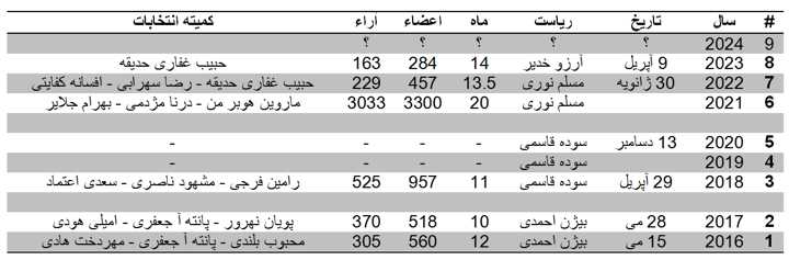 انتخابات 2024 کنگره ایرانیان سال گذشته انتخابات در 9 آپریل با فاصله 14 ماه از انتخابات قبلی برگزار گردید. تا این تاریخ انتخابات امسال اعلام نگردیده است. در انتخابات امسال قرار است که دو عضو هییت مدیره، رضا نامداری و دانیل باقر سروستانی جایگزین گردند. مگر اینکه مانند سال گذشته این دو عضو نیز مانند آرزو خدیر (ریاست کنگره) و امیر حسن قاسمی نژاد تفرشی (سیاست گذاری) برای یک دوره دوساله دیگر آمادگی خود را اعلام کنند. فعالیت های 2023 فعالیت های 2023 به برگزاری جلسات گفتگو در کلاب هاوس (امیر حسن قاسمی نژاد تفرشی) و مصاحبه در اینستاگرام (مونا برقعی) و چندین پادکست (دانیل باقرسروستانی) خلاصه شده است. لیست کامل فعالیت ها در سایت انجمن اعضای کنگره ایرانیان در بخش آی سی سی پدیا در دسترس میباشد. https://www.iccma.ca/iccpedia/iccpedia-2023.htm انتخابات در هشت سال حاکمیت همسویان بر کنگره ایرانیان هشت سال از حاکمیت هییت مدیره های همسو میگذرد.