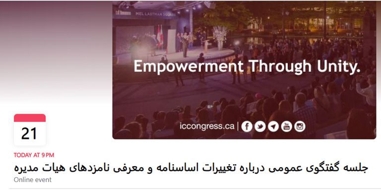 جلسه معرفی دو نامزد انتخاباتی و توضیحی در رابطه با تغییرات اساسنامه امشب جمعه ۲۱ جون ساعت نه شب درست است که بسیاری از ما با هییت مدیره های اخیر کنگره مخالف هستیم ولی این باعث کم شدن اهمیت و توجه ما به این نهاد نباید بشود. بخصوص که قرار است دو عضو جدید، شیلا دعایی و ارغوان امامی در جایگزینی رضا نامداری و دانیل باقر سروستانی به هییت مدیره بپیوندند. با این امید که این دو عضو جدید که به نظر میاید تازه به عضویت کنگره پیوسته اند تحولی را در هییت مدیره بوجود آورند. متاسفانه امسال نیز انتخابات حالت فرمایش خواهد داشت و با پیوستن این دو تن، کلیه اعضای هییت مدیره غیر منتخب خواهند بود. چه خوب میشد که مخالفین به جای خوشنود شدن از وضعیت و خیم فعلی این نهاد که نشان از بی کفایتی هییت مدیره های آن میباشد، کمی هم به شایستگی این کامیونیتی برای داشتن چنین نهاد و چنین هییت مدیره ای بیاندیشیم، متاسف شویم و شرمسار گردیم. https://www.facebook.com/events/1458631241527772