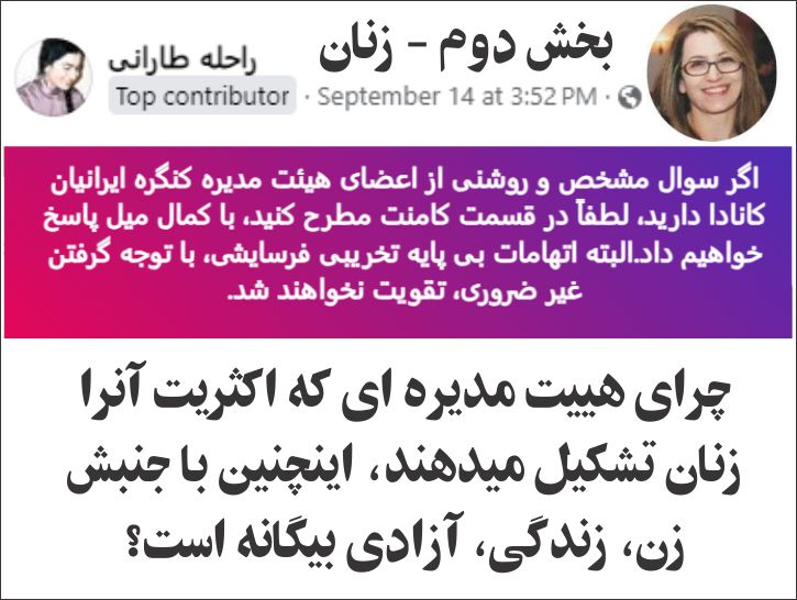 بخش - دوم زنان در هییت مدیره به مناسبت سالروز جنبش زن، زندگی، آزادی، این بخش از سئوالات خود از راحله طارانی را به آن مربوط میسازم. ۱- سال گذشته و امسال برای اولین بار در کنگره ایرانیان، هییت مدیره هایی را داشته و داریم که زنان اکثریت آنرا تشکیل میدهند. آیا اعضای هییت مدیره به این حالت خاص واقف هستند؟ آیا از این فرصت برای عمل به گونه ای دیگر استفاده مینمایند؟ در این دوره چه فعالیت هایی متفاوت از دوره های دیگر صورت گرفته است؟ آیا مختص شدن فعالیت های کنگره به گفتگو در اینستاگرام و کلاب هاوس را میتوان به حساب این حالت خاص گذاشت؟ ۲- جنبه های سیاسی به کنار، جنبش زن، زندگی، آزادی، جنبه های اجتماعی، بخصوص در رابطه با حمایت از حقوق زنان، ارزش قائل شدن برای زندگی، و احترام به آزادی در خود دارد، که تاثیرات آنرا در جهان شاهد هستیم. چرا هییت مدیره با اکثریت زن نسبت به این جنبش اینقدر بیگانه عمل مینماید؟ ۳- آیا به سخنان مونا قاسمی، نایب رئیس کنگره در یکی از پادکست های کنگره گوش داده اید؟ آیا متوجه تاثیرات مخرب اعتقادات سنتی و مذهبی پدر و مادر ها در تربیت کودکان و نوجوانان، بخصوص دختر ها، آنهم در کانادا شده اید؟ چرا به عنوان یک زن روانشناس از جایگاه خود در هییت مدیره برای واکنش به این پدیده ها بصورت فعالیت های جمعی استفاده نمیکنید؟ ۴- امسال دو عضو جدید زن به هییت مدیره پیوسته اند. هر سال بلافاصله هییت مدیره ای تشکیل، سمت ها تعیین و از طریق صورتجلسه ای اعلام میگردند. دو ماه و نیم از آغاز دوره جدید میگذرد و چنین عملی صورت نگرفته است. آیا این بی احترامی و ارزش قاپل نشدن برای دو عضو جدید و قصور از وظایف هییت مدیره نیست؟ ۵- در رابطه با ارغوان امامی، عضو جدید هییت مدیره که از قضا یک زن میباشد و نمیخواهد چهره خود را نشان دهد چه فکر میکنید؟ آیا این امری طبیعی است؟ آیا باید از کنارش گذشت و آنرا نادیده گرفت؟ آیا قصور هییت مدیره در اعلام سمت های اعضا به این مورد خاص مربوط میگردد؟ آیا زمانی که حجاب یکی از موضوعات اصلی جنبش زن، زندگی، آزادی میباشد، عدم تمایل به نمایان ساختن چهره، فرصت مناسبی برای مطرح کردن موضوعات مختلف در این رابطه نیست؟ آیا نحوه عمل فردی و جمعی هییت مدیره به این مورد خاص و پر اهمیت لطماتی را به اعتبار این نهاد وارد نمیسازد؟ اگر در وضعیت مناسب تری قرار داشتیم ایا چنین فردی میتوانست به هییت مدیره راه یابد؟ با آگاهی از اینکه از اکثر اعضای فعلی هییت مدیره دعوت شده و این افراد با پای خود به کنگره نزدیک نشده اند، و انتخاباتی هم در میان نبوده، علت اینگونه رفتار ها که جز بی اعتباری و بی فایده بودن این نهاد حاصل دیگری ندارد چیست؟ ۶- قبل از پیوستن به این نهاد آیا با مشکلات آن آگاهی داشتید؟ اگر نداشتید چرا پیوستید؟ آگر آگاهی داشتید چه فعالیتی برای رفع نواقص کرده اید؟ آیا مشکلات این نهاد و کامیونیتی فقط به سلامت روان مربوط میگردند؟ آیا شما خود را نماینده بخشی از کامیونیتی میدانید و یا متخصص استخدامی این نهاد؟ ۷- گرچه سئوالات متعدد میباشند ولی در مجموع به یک نکته اشاره میکنند، وضعیت نامناسب این نهاد به دلیل بی کفایتی هییت مدیره. شما سهم خود را چقدر در آن میبینید؟