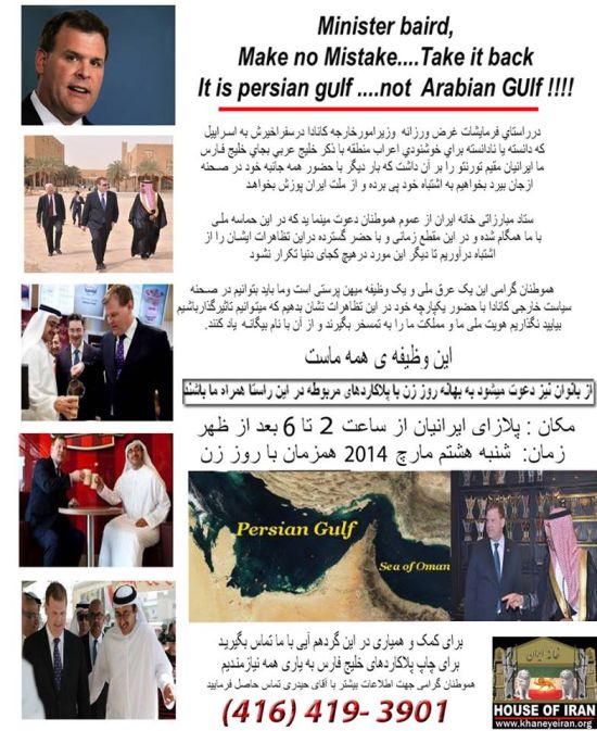 با تشکر فراوان از آنانی که بار سنگین برقراری تظاهرات دوم در رابطه به اعتراض به تعرض لفظی جناب جان برد وزیر امور خارجه کانادا به خلیج فارس را بر دوش میکشند. اینبار آنچنان رفتار کنیم که راهی جز استعقاء برای جناب وزیر باقی نماند. کمترین کاری که هر کدام از ما میتوانیم بکنیم اطلاع رسانی میباشد. پس به اشتراکش بگذاریم. و یا اعلامیه آنرا که در نشریات ایران استار، شهرما، سلام تورنتو و تماشا به چاپ رسیده را از روزنامه جدا و در محافل عمومی، شیشه مغازه ها، در ساختمانی که زندگی میکنیم و در آن ایرانیان متعدی هستند و حتی به صورت فلایر یه این و آن دهیم. اگر هیچکدام از این کار ها را نکردیم میتونیم آنرا بر روی مقوائی چسبانده و برای خود تابلوئی ار برای روز تظاهرات درست کنیم. انشالله که تا آنروز چاپخانه ها و تابلو ساز ها هم به این حرکت میپیوندند و طوری رفتار خواهند کرد که حتی مسافرینی که در حال پرواز در آسمان میباشند ببینند و بدانند که فریاد ما از چیست.