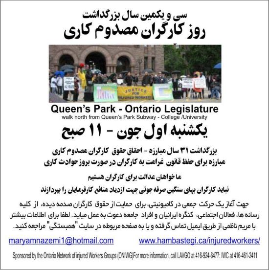 تعداد کارگران صدمه دیده کاری در کامیونیتی ما کم نیست. بسیاری از آنان به حقوق خود آگاه نمیباشند. مریم ناظمی خود یک صدمه دیده کاری میباشد که بیش از ده سال برای حمایت و احقاق حقوق این افراد در کانادا تلاش میکند. شاید زمان آن رسیده که به او پیوسته و در این مسیر اقدام به یک حرکت جمعی کنیم.