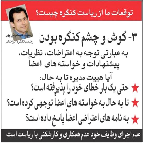 به هیچ عنوان هدف، تخریب، تضعیف و یا تعویض ریاست کنگره نیست. هدف مجبور به استعفاء دادن اعضائی که فعال نیستند، نیست. هدف درس گرفتن از اشتباهاتست به نحوی که دیگر تکرار نگردند. - بار دیگر به کسی رای ندهیم که در مدت دو ساله عضویتش در هییت مدیره حتی حداقل را نیز انجام نداده است. پس باید کاری کنیم که امکان شناخت کاندیدا ها قبل از انتخابات بوجود آید. - به نحوی عمل کنیم که اعضای هییت مدیره قبل از آنکه سمت هائی اجرائی همچو ریاست را به عهده بگیرند، لیاقت های خود را در عمل به ثبوت رسانده باشند. - آنچنان عمل کنیم که کاندیدا های سال آینده بدانند که زمان تغییر کرده است و توجه کامیونیتی هر روز به عملکرد کنگره و هییت مدیره اش بیشتر میگردد. به آنها این پیام را بدهیم که در این نهاد دیگر جائی برای آنهائی که نمیخواهند به کامیونیتی خدمت کنند نیست. آماده سازی را از هم اکنون آغاز کنیم که سال آینده را مانند امسال از دست ندهیم. متاسفانه اکثر اعضای فعلی هییت مدیره را کسانی تشکیل داده اند که علاقه ای به فعالیت ندارند، و تمایل و شهامت استعفا را نیز در خود نمی بینند. ریاست کنگره را کسی به عهده گرفته است که در عمل نشان داده است شرایط لازم را برای این کار ندارد. متاسفانه رای پس گرفتنی نیست، و عقربه های ساعت را نمیتوان به عقب برد.