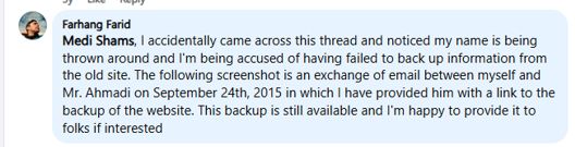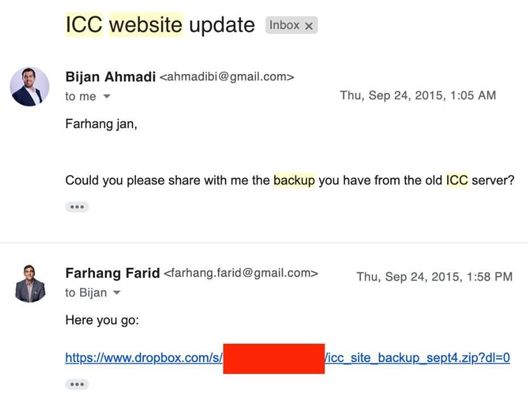 of taking a back up of all the files on the previous website. Couple of points about the website: - The board of directors in 2015-2016 approved the website update and it was done under their full supervision. - I spent hundreds of volunteer hours in developing our current website and database. It would cost the organization between $5K-10K to hire professionals to do this work. ICC could not provide the budget and I agreed to spend the time myself to do this. - The current website works based on a powerful CMS that's designed for non-profit organizations. The new website since its development has provided the ICC significant advantage and capability in improving its communication channels. It's unfortunate that instead of appreciating these efforts and hundreds of volunteer hours spent you send this email threat to take legal action! Regards, - Bijan Ahmadi ____________________________________ دعوت به شرکت در جلسه گفت و شنید 24 ین دعوتنامه را چند لحظه پیش ارسال داشتم. اوائل تعجب میکردم که چرا این دعوت ها نتیجه نمیدهند و همیشه همان تعداد همیشگی در جلسات حضور پیدا میکنند. آرام آرام با شناخت بیشتر از کامیونیتی تعجبم به کنار رفت و جایش را تعجب دیگری گرفته است. در تعجب این منم که چرا خسته نمیشود و هر روز به عکس مصمم تر هم میشود. به امید دیدار فردا.