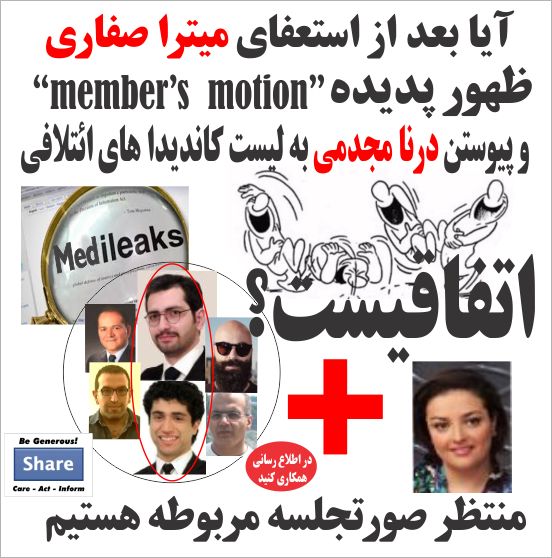 این پوستر از فوروم کنگره حذف شده است جالب است که تایاز فخری، رهبر کاندیداهای ائتلافی، در دو مقاله اش در سلام تورنتو، نحوه مدیریت بیژن احمدی، رهبر انتخابات فرمایشی-نمایشی، در کمیته مشارکت جمعی را باز و دموکراتیک قلمداد میکند. البته که گول ظواهر را نخوردن و پی بردن به ماهییت ها نیاز به تجربه، شناخت و موشکافی دارد. ولی آنچه در این انتخابات میگذرد آنقدر واضح و آشکار است که نیازی به تیز بینی و دور اندیشی ندارد. هم بیژن و هم تایاز آنچنان به دنبال یکدست کردن هییت مدیره آینده هستند که حتی برای ظواهر امر هم که شده اجازه نمیدهند که بیگانه ای در میان آنها وجود داشته باشد. انگاری محافظه کاری سال گذشته امسال به ترس مبدل گردد. جای ترس هم وجود دارد اگر آن بیگانه مهدی شمس باشد و وای به روزی که او نیز به خانه راه یابد.