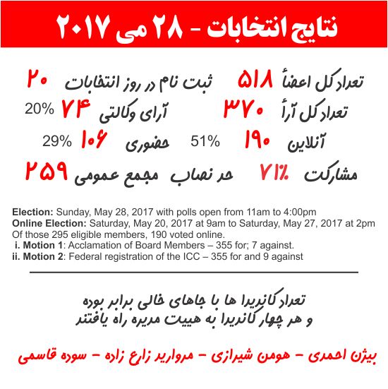 مجمع عمومی و انتخابات دوره دهم کنگره ایرانیان روز یکشنبه گذشته در سیویک سنتر نورت یورک برگزار گردید. این انتخابات در نوع خود از چند لحاظ منحصر به فرد میبود. انتخابات آنلاین برای اولین بار اجرا گردید که از 295 نفر حائز شرایط 190 نفر از این طریق رای دادند. جدید بودن این روش و همچنین عدم اطلاع رسانی کافی باعث شده بود که ابهامات و سئوالاتی پیرامون این مورد، بخصوص از لحاظ کنترل و امنیت مطرح بود. 328 نفر نیز حائز شرایط برای رای دادن حضوری و وکالتی بودند که 180 نفر از آنها از این طریق در انتخابات شرکت کردند. مشخص نیست که چرا امسال تعداد آرای وکالتی اعلام نشده است. در انتخابات امسال دو مورد به رای گیری گذاشته شد. رای جمعی به چهار کاندیدا که با ابهاماتی همراه، و هنوز مشخص نیست که به چه دلیل امکان اظهار نظر جداگانه به هر کاندیدا از رای دهندگان گرفته شده بود. باید در نظر داشت که به علت برابری تعداد کاندیدا ها با تعداد اعضای مورد نیاز، انتخابات تاثیری در حاصل کار نمیداشت. در این رابطه یکی از اعضای هییت مدیره بدون آنکه به اصل مطلب بپردازد به پاسخ گوئی حاشیه ای در سوشیال مدیا میپردازد. مورد دوم رای گیری در رابطه با تغییر ماهییت کنگره از استانی به فدرال بود، که آنهم با اعتراضات جدی روبرو شده که همچنان ادامه دارند.