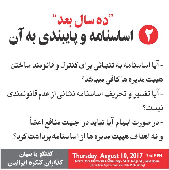 در اینکه اساسنامه نیاز به بازبینی دارد شکی نیست. چهار سال متوالی بر روی آن کار شد و نتیجه آن چند تغییر جزئی میباشد که در مجمع عمومی 2016 به تصویب رسید. دو اشکال اساسی در هر چهار باری که بازبینی صورت گرفت وجود داشت: 1- روش عمل - بازبینی ها پشت درب های بسته صورت گرفت و اکثریت اعضاء در گفتگو ها شرکت نداشتند. 2- عدم توجه به نکات اساسی - به علت آنکه بیشتر به فرئیات توجه شد اساسنامه های بازبین شده فرق چندانی با اساسنامه کنونی ندارند. هر چقدر هم که اساسنامه فعلی نواقص و کمبود هائی داشته باشد باز رعایت نشده و هییت مدیره ها در ده سال گذشته آنرا در جهت اهداف و نظرات خود تعریف و تحریف کرده اند. آنچه مسلم است اگر در اعضاء هییت مدیره قانومندی نهادینه نشده باشد تکمیل ترین اساسنامه نیز اجرا نخواهد شد. در شرایط کنونی به نظر میاید که آنچه بیشتر از همه به آن نیازمندیم آیین نامه های اجرائی میباشند که بطور اخص در بعضی از موارد مشکل ساز راهنما باشند.