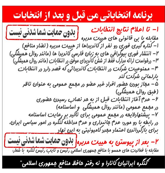 فارسی کاندیدا ها 3- درخواست ارائه مدارک بعد از انتخابات و فقط از کاندیداهای موفق متاسفانه با گذشت زمان عدم اعتماد در کنگره ایرانیان که بیشتر حاصل رفتار های غیر قانونی و تفرقه انگیز هییت مدیره ها میباشند در حال گسترش است. شاهد هستیم که اخیرن با افزایش رفتار های غیر قانونی، هییت مدیره ها سعی دارند با مته به خشخاش گذاشتن و به اصطلاح رعایت مفاد اساسنامه به گونه ائی تصویری از قانونمندی خود در اذهان عمومی بوجود آورند. اخیرن شاهد هستیم که از کاندیدا ها گواهی شهروندی و گواهی عدم سوء پیشینه درخواست میشود. حتی اگر اساسنامه را به گونه ائی تلقی کنیم که ارائه این مدارک الزامی میباشد، درخواست آنها فقط از کاندیدا هائی که در انتخابات موفق میگردند معقول تر به نظر میاید. خواهشمندم به این نکته نیز توجه شده و اقدامات لازم به عمل آید. 4- ممنوعیت شرکت در انتخابات کاندیدائی که قصد دارد در انتخابات پارلمانی شرکت کند از آنجائیکه هییت مدیره بر خلاف اساسنامه انتخابات امسال را یکماه زودتر برگزار کرده و قبل از تشکیل هییت مدیره جدید تصمیم گرفته است که در انتخابات استانی فعال باشد، پذیرش نامزدی یکی از کاندیدا ها اگر قصد داشته باشد در انتخابات استانی شرکت کند، برخلاف اساسنامه است. بخصوص که یکی از اعضای خانواده این فرد در هییت مدیره کنونی عضویت داشته و کاندیدای انتخاباتی سال آینده کنگره نیز میباشد. به نظر میاید که این افراد با کمک هییت مدیره قصد دارند که این نهاد را به دفتر کمپین انتخاباتی مبدل سازند. 5- مجاز بودن حضور افراد غیر عضو در مجمع عمومی به عنوان ناظر متاسفانه با گذشت زمان و از میان رفتن حسن نیت که بیشتر حاصل رفتارهای ناخوشایند هییت مدیره ها بوده، در سال های اخیر از حضور افراد غیر عضو در مجمع عمومی به عنوان ناظر ممانعت به عمل میاید. خواهشمندم به این نکته توجه کرده و طوری برنامه ریزی شود که افراد عادی هم مجاز باشند که بصورت ناظر در مجمع عمومی حضور داشته و از آن بهره مند گردند. 6- عدم آغاز انتخابات و یا هر گونه رای گیری قبل از به حد نصاب رسیدن حضوری در مجمع عمومی متاسفانه در سال های اخیر متداول شده است که انتخابات و رای گیری لوایح قبل و بدون رسیدن به حد نصاب حضوری در مجمع عمومی اجرا گردد. لازم به تذکر است که این امر بر خلاف اساسنامه و غیر قانونی بوده و فرایند های آن فاقد اعتبار میباشند. خواهشمندم امسال به این نکته توجه شده و آنطور که اساسنامه معین کرده است رفتار شود. 7- اعلام تعداد اعضای کنگره مهدی شمس – کاندیدای انتخاباتی و عضو احتمالی هییت مدیره سال آینده
