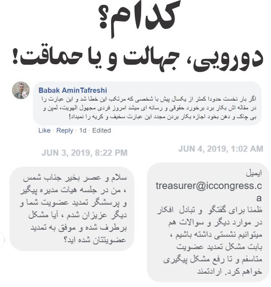 قبل از ورود بابک امین تفرشی به کنگره هیچکدام از ما شناختی از او نداشتیم. امروز درمییابیم که این فرد در دل و روده خود چه میپروراند: "اگر بار نخست حدودا کمتر از یکسال پیش با شخصی که مرتکب این خطا شد و این عبارت را در مقاله اش بکار برد برخورد حقوقی و رسانه ای میشد امروز فردی مجهول الهویت، لمپن و بی چاک و دهن بخود اجازه بکار بردن مجدد این عبارت سخیف و کریه را نمیداد!" _____________________________________