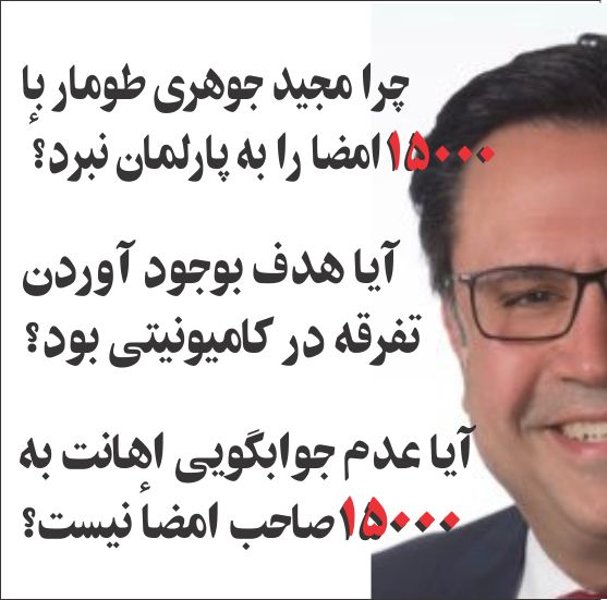 اگر کاندیدا ها در زمان انتخابات جوابگو نباشند چه زمانی میتوان آنها را جوابگو ساخت؟ عده ای از ضوابط حزبی سخن میگویند. آیا زیر فشار گذاشتن دولتی توسط نماینده ای که از نظر حزبی به آن دولت وابسته است نشان از آشنایی آن کاندیدا با با رسم و رسوم ضوابط حزبی است؟ اگر مجید جوهری در سال 2016 که به همراه بیژن احمدی رئیس هییت مدیره کنگره به ونکوور، خارج از حوزه انتخاباتی اش، سفر میکرد اینروز ها را پیش بینی کرده بود، چه بسا که هر گز ره رفته را طی نمیکرد. اینکه مجید جوهری به این سئوال ساده جواب نمیدهد برای من معمائی شده است. نظر شما چیست؟ چرا مجید این طومار را اسپانسر شد؟ چرا آنرا به پارلمان نبرد؟ چرا پاسخگو نیست؟ یکبار از روی عدم شناخت به این فرد اعتماد کردیم، اعتماد مجدد خطاست!