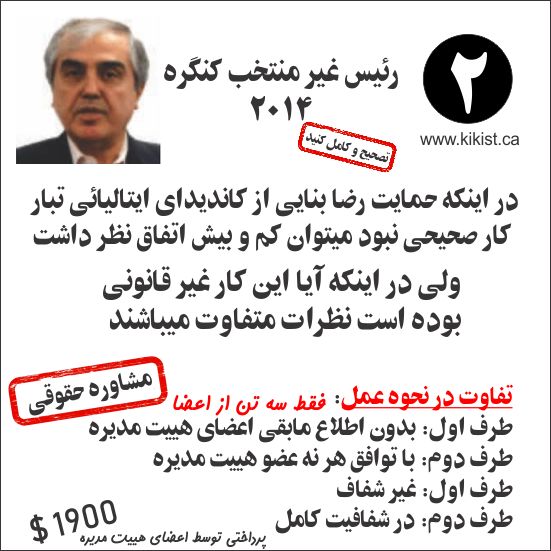 شاید نحوه پیوستن رضا بنایی به هییت مدیره و حمایتش از کاندیدای ایتالیائی تبار انتقاد پذیر باشند ولی در نحوه مدیریت و رفتار دموکراتیک ایشان در مقایسه با روسای دیگر این نهاد کمتر جای بحث و گفتگو است. 1- بهروز آموزگار، رضا قاضی و فرهنگ فرید بدون مطرح کردن در هییت مدیره در رابطه با حمایت رضا بنایی از کاندیدای ایتالیایی تبار با وکیل مشورت و بیانیه آنرا در سلام تورنتو منتشر میکنند. 2- رضا بنایی این موضوع را در هییت مدیره مطرح میکند و با موافقت همه اعضاء به یک وکیل دیگر جهت مشاوره مراجعه میکند. نظر مخالف وکیل اول را در سلام تورنتو به چاپ میرساند. از مخارج و نحوه پرداخت آن نیز سخن میگوید. خواندن هر دو بیانیه و توضیح هر دو طرف را برای بهتر شناختن افراد توصیه میکنم
