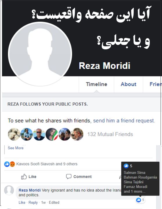 سری به صفحه سلمان سیما زدم تا ببینم در رابطه با سرود خواندنش در تظاهرات روز پنجشنبه چه گفته است. سخت متعجب، متاسف و اندوهگین شدم. از آن بدتر با کامنتی در تائید یکی از مطالب دیگرش به اسم رضا مریدی و بدون عکس مواجه شدم، توسط خود سلمان، بهمن رودگرنیا، و سیما تاجدینی لایک خورده است. به آن صفحه رفتم و دیدم که 132 دوست مشترک داریم. حتمن میگویید که چرا با خود ایشان تماس نگرفته و جویا نمیشوم. این به بفکرم رسید ولی با خودم گفتم وای اگر بگوید که این صفحه به او تعلق دارد، آنموقع چه باید کنم؟