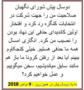 با اینکه بعد از پیروزی نسبتن ساده در انتخابات 2015 با مشکلاتی مواجه شدیم، هنوز فکر میکردم که میتوان به راحتی در کنگره تغییر و تحول بوجود آورد. غافل از اینکه اگر این نهاد در تسلط کسانی قرار گیرد که با هدف و منافعی در فعالیت های این نهاد شرکت کنند به سادگی نمیتوان درمقابل انها ایستاد. بخصوص اگر فرهنگ مشارکت وجود نداشته باشد. باز هم تکرار میکنم در مرحله ای از انتخابات هستیم که نیاز به داشتن کاندیدا ها بسیاری است. کاندیداهائی که هدف نهائی شان حتمن به پیوستن به هییت مدیره نباشد. کاندیدا هایی که در این مرحله بالا بردن آگاهی جمعی در کامیونیتی، افزایش اطلاعات، آشنائی بیشتر با این نهاد در خود و دیگران، و افزایش تعداد اعضاء را از طریق شرکت در گفتگو ها رااز وظایف خود بدانند.