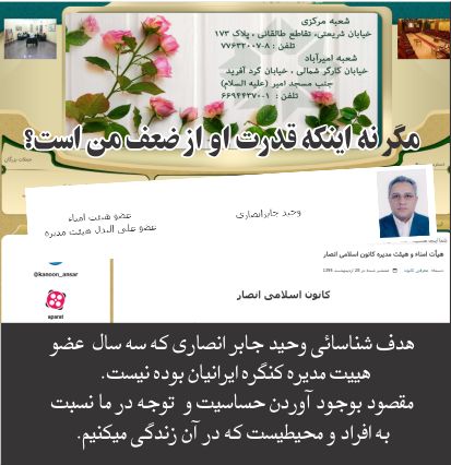 با فشار بر یک دگمه و یا تایب چند حرف میتوان کلی اطلاعات در رابطه با افراد، از جمله وحید جابر انصاری به دست آورد. ولی چند نفر از ما این زحمت را به خودمان میدهیم؟ توصیه میکنم که اینکار را بکنید و ببینید چقدر در رابطه با این فرد اطلاعات موجود است. با اینکه زمانی که به شعله خلیلی، نایب رئیس کنگره تذکر داده میشود که چه بسا این فرد در ایران به سر میبرد، کافیست که به جواب او مراجعه کنید تا به میزان مسئولیت پذیری ایشان پی ببرید. شعله خلیلی هم اکنون هفتمین سال حضور در هییت مدیره را پشت سر میگذارد.