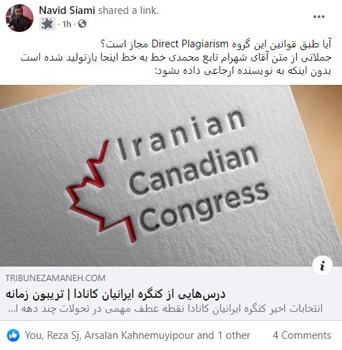 ممکن است که اشتباه کنم. در اینصورت من را مطلع ساخته و از قبل پوزش میطلبم. این مطلب را که دیروز در این صفحه به اشتراک گذاشتم و مطمئن هستم که حداقل ۴ ساعت زنده باقیماند، بدون اخطار حذف گردید.. قابل توجه اینکه این مطلب توسط یکی از مهره های اصلی کارزار و یکی از اعضای کهنه کار و سرنوشت ساز این نهاد نوشته شده است. اگر محتوای آن دروغ و یا در آن توهین و افترایی هم باشد، برای اثبات عدم حقانیت کارزار میتواند سند و شاهد خوبی باشد. پس من دلیل حذف آنرا نمیابم.. مگر اینکه اطلاعاتی در آن باشد که آزار میدهد، آگاهی بوجود میاورد، اطلاعات غلط را تصحیح میکند. که در اینصورت نیز سند و شاهدی بر حقانیت کارزار است و حق وجود دارد. هر دو حالت به کنار! آزادی بیان و حق دانستن چه میشود؟ تعرض و توهین به من، به عنوان یک مشترک این صفحه و یک عضو این نهاد چطور؟ با این امید که حذف کننده این مطلب که حداقل نیاز به چهار ساعت مشورت داشت، توضیحاتی را در اختیار ما بگذارد. در ضمن از اینکه باعث میگردد مورد آزادی بیان و حق دانستن در این صفحه تکرار و تکرار گردد متشکرم. اگر نتوانیم این نهاد را آنطور که باید بسازیم، شاید از طریق این رفتار های درست و یا غلط بتوانیم یکی از موهبات به دست آمده در کانادا را مطرح، در باره اش بیاندیشیم، گفتگو کنیم تا در نهایت آنرا نهادینه کنیم. یکبار دیگر سعی کردم از ادب دور نگردم. نام کسی را نیاورم. به کسی توهین نکرده باشم. افترا نزده باشم تا ضوابط این صفحه، که مخالف منشور حقوق و آزادی های کانادا میدانم زیر پا نگذاشته باشم.