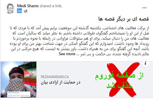 رضا نامداری عزیز این مطلب به شخص شما مربوط میگردد. حتی اگر با ضوابط فوروم متغایر باشد، در صورت موافقت شما باید بتوان آنرا در فوروم به اشتراک گذاشت. خواهشمندم من را از نظرات خود و دریافت این ایمیل مطلع سازید. با تشکر – مهدی شمس