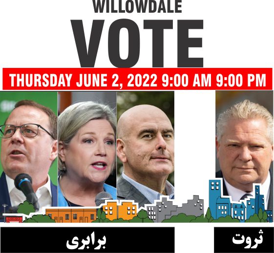 حتمن در انتخابات شرکت کنیم. حتی آنهاییکه در انتخابات پیروز میشوند از اینکه تعداد کمی در انتخابات شرکت کرده اند خوشنود نخواهند بود.. مشارکت بیشتر در انتخابات یک پیروزی برای همه ماست. در ویلودیل از جمعیت ۱۱۸۸۰۵ نفری ۷۵۸۴۱ نفر دارای حق رای میباشند. استن چو تنها با ۱۷۷۳۲ رای، که معدل ۴۴٪ درصد آرا در انتخابات قبلی به پارلمان راه یافت. این فقط ۱۵٪ درصد از کل جمعیت و ۲۳٪ کل کسانی میباشد که حق رای داشتند. برخی افراد ممکن است سیاست را پیچیده بدانند و فکر میکنند که به اندازه کافی اطلاعات در اختیار ندارند تا بتوانند تصمیم گیری کنند. از آنها دعوت میکنم که در رابطه با روش من بیاندیشند و اگر آنرا منطقی دیدند از آن استفاده کنند. اگر طرفدار ثروت هستید به محافظه کاران رأی دهید. اگر طرفدار برابری هستید، به یکی از احزاب دیگر رأی دهید اگر می خواهید رأی شما در نتایج انتخابات امسال تاثیر گذار باشد، به لیبرال ها یا محافظه کاران رأی دهید. به هر حال لطفا رای دهید در نظر داشته باشیم که در ویلودیل رقابت تنگاتنگی وجود دارد. هر یک رای تاثیر گذار خواهد بود. Willowdale Vote Even the winner won't be happy with a victory when participation is low. High participation is a victory for all of us. We have 75,841 electors on the list for a population of 118805 in Willowdale. Stan Cho took office with only 17,732 votes, winning 43.63 percent of the vote in the 2018 Ontario provincial election. This is just 15% of the population or 23% of voters. Some people may find politics complicated and don't know enough to make a decision. Let's see it my way; vote conservatives if you are for wealth. If you are for equality, vote for one of the other parties. If you want your vote to affect the result, vote for Liberals or Conservatives. In all cases, PLEASE VOTE