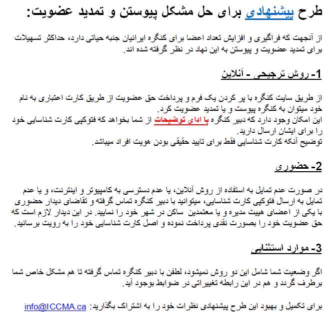 ساده تر از تعرض، تهمت و نیت خوانی، بررسی عملکرد افراد است. نمیدانم که چرا هییت مدیره از گفتگو هراسان است. البته میدانم و میدانند و میدانید چرا. بیشتر از هر فرد دیگری به این نهاد توجه میکنم و برایش وقت میگذارم و مشکلاتش را به خوبی میشناسم. همیشه مستند سخن گفتم و با استدلال. از احمد احساندار دعوت میکنم که به جای ضد و نقیض گویی و تهمت و تعرض و نیت خوانی به گفتگو در رابطه با طرح پیشنهادی من بپردازد. که نه تنها مشکلات پیوستن به کنگره برطرف خواهند شد، بلکه اولین قدم در نفس شکنی، تفاهم و همکاری برداشته خواهد شد. بخوبی میدانم که کار ساده ای نیست و عمریست که در این مسیر قدم برمیدارم. https://www.iccma.ca/htm/Protocols/Membership.htm