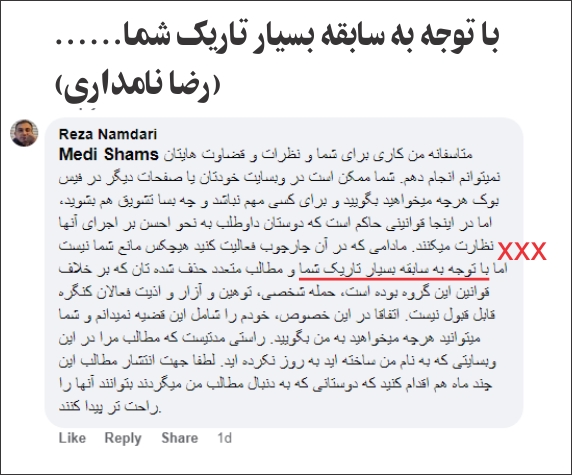 جهت ثبت در تاریخچه فوروم کنگره و نحوه مدیریت رضا نامداری به بهانه تهمت و توهین و افترا بسیاری از مطالب من از فوروم کنگره حذف شده اند. ولی برای رضا نامداری آدمین این صفحه، عضو هییت مدیره و سرپرست فعالیت های مجازی کنگره ایرانیان از اینکه به "سابقه بسیار تاریک" من اشاره کند و نگوید که این سابقه کدام است اشکالی وجود ندارد. من مشکلی ندارم که چنین مخاطب قرار گیرم و خیلی مایلم که جناب رضا نامداری آزادنه سخن بگوید و گفته خود را مستند سازد. شاید همین "سابقه بسیار تاریک" باعث شده است که: -