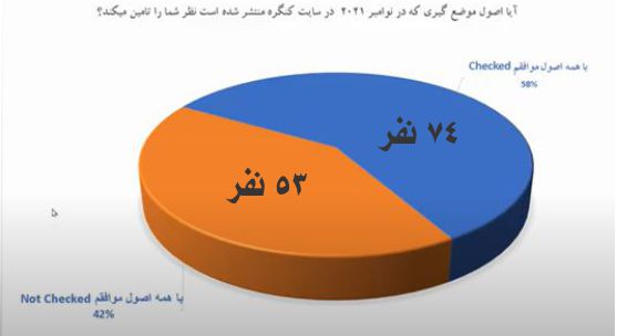 نفر از اعضاء در نظر سنجی اخیر شرکت کرده اند: ۲- ۹۹ نفر با بیانیه های هییت مدیره در رابطه با اتفاقات اخیر موافق و ۲۸ نفر مخالف بوده اند. ۳- ۷۴ نفر با اصولی که هییت مدیره در نوامبر ۲۰۲۱ اتخاذ کرده موافق و ۵۳ نفر مخالف میباشند. ۱- آیا همینکه یک سوم اعضاء با اینکه ۵ بار با آنها تماس گرفته شده است در این نظر سنجی شرکت نکرده اند، به گونه ای نظر سنجی نیست؟ ۲- و یا اینکه از ۲۰۰ نفری که ایمیل های خود را بازکردند ولی فقط ۱۲۷ نفر واکنش نشان داده اند چطور؟ ۳- شاید لازم باشد با در نظر گرفتن اینکه اکثر مخالفین هییت مدیره این نهاد را ترک کرده اند نتایج این نظر سنجی را بررسی کرد.