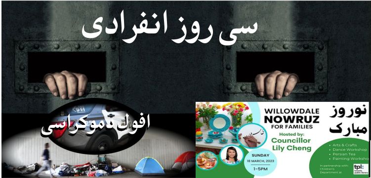 مدیره قبلی در کنگره ایرانیان پرداختم. چرا یادآوری واقعیات و مقایسه آن با واقعه ای حقیقی در سطح جامعه بزرگ، برای اعضای هییت مدیره و گردانندگان فوروم کنگره ایرانیان، باید آنقدر آزار دهنده باشد تا اقدام به حذف مقاله ام نمایند؟ برنامه نوروزی در ویلودیل البته در تاریخ ۲۶ فوریه مطلبی در رابطه با برنامه نوروزی در ویلودیل که به همت نماینده شورای شهر تدارک دیده شده به اشتراک گذاشتم. این مطلب هم حذف نشد و در بخشی که به کنگره مربوط میشد موردی ندیدم که مستحق یکماه انفرادی باشد: «چرا کنگره ایرانیان با همکاری شهرداری ریچموندهیل چنین گردهمایی را تدارک نمیبیند؟ لیلی چنگ با اطلاع از اینکه تعداد ایرانیان زیادی در ویلودیل زندگی میکنند وظیفه نمایندگی خود را به جا آورد و چه بسا از این طریق قصد دارد که ایرانیان را ترغیب کند که در فعالیت های جامعه بزرگتر حضور بیشتری داشته باشند. کنگره ایرانیان در مقابل همه ایرانیان کانادا چنین وظیفه ای را دارد ولی متاسفانه احساس مسئولیت نمیکند. این هم یک فرصت دیگر برای اینکه دموکراسی را بیاموزیم، تجربه کنیم و آنرا در خود نهادینه کنیم.»