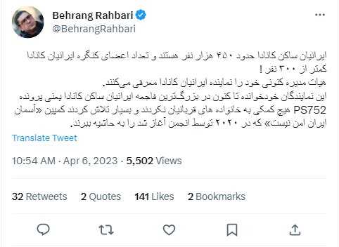 برانداز نما های 2020 کجایند؟ تصویر توییت دیروز بهرنگ رهبری را به اشتراک میگذارم و از خود میپرسم: آیا آن 5500 نفری که این توییت را مشاهده کردند، 141 نفری که آنرا لایک کردند و 32 نفری که آنرا ریتوییت کردند، از خود نمیپرسند که در کشور دموکراتیک کانادا چرا 450 هزار ایرانی عاجزند که کنگره را از شر 300 نفر رها کنند؟ چرا در دو انتخابات دو سال گذشته از برانداز نماهای 2020 خبری نیست؟ کافیست که باز گروهی همت کند و پا به میدان بگذارد تا این افراد باز سر و کله شان پیدا شود و به خرابکاری بپردازند تا اولن جایگاه خودشان را از دست ندهند و هر روز حرفی برای گفتن داشته باشند. https://twitter.com/BehrangRah.../status/1643990448002809856