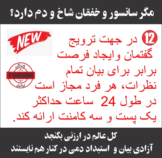 هر دم از باغ بری میرسد این هم از آخرین های رضا نامداری و مهدی صمدیان در فوروم کنگره. کمتر کسی را دیده ام که بیشتر از یک مطلب در فوروم به اشتراک بگذارد. جزء نسیم نوروزی که در زمان های حساس به ایشان متوسل میشوند و در یکروز 11 مطلب به اشتراک میگذارد. در صورت لزوم نسیم نوروزی مانند بمب افکن های سنگین وارد صحنه شده و مطلب باران میکند. https://www.iccongress.club/htm/2021/210223.htm از جهاتی نسیم نوروزی در مونترال معادل دلشاد امامی در تورنتو میباشد که به نظر میاید به ایران بازگشته. هدف تغییرات جدید بیشتر ممانعت از گفتگو است. مهم نیست چند مطلب در روز به اشتراک گذاشته میشود که در وضعیت فعلی تعداد خیلی پایین است. ولی به نظر میاید که بزودی اعضای آزمایش دیده در کلاب هاوس، اینستاگرام، و گردهمای های محفلی/خصوصی در زوم وارد صحنه فوروم خواهند شد. محدود کردن من و بهرام جلایر، تنها مخالفین در فوروم به هر کدام چهار کامنت، تا زمانیکه پیاده نظام ورزدیده گردند برای همسویان حیاتی میباشد. تازه تر از تازه ای میرسد تغییرات جدید در تاریکی و بی سر وصدا اطلاع رسانی میشود تا توان سانسور آدمین ها افزایش پیدا کند و آنهایی که از بند جدید اطلاعی ندارند، منحرف گردند و به دنبال دلایل دیگری برای حذف مطلب خود باشند. https://www.facebook.com/groups/forumicc/posts/2247397692137370/ ضوابط فوروم بازبینی شده به اشتراک گذشته میشود ولی اشاره ای به بند جدید 12 نمیشود. غیر از من چه کسانی به جزییات توجه میکند تا متوجه بند جدید 12 گردد؟ آشکار است که هدف بهبود وضعیت فوروم و یا افزایش دیالوگ نیست. منتظر تغییرات بیشتری در مدت 30 روز ممنوع الکلام شدن خود در فوروم هستم. در نظر داشته باشیم که من در روز 11 جولای بلاک میگردم، در 12 جولای نامه به رهبران احزاب ارسال میشود، در 13 جولای ضوابط تغییر میکنند. باید منتظر تازه تر از تازه های بعدی بود.